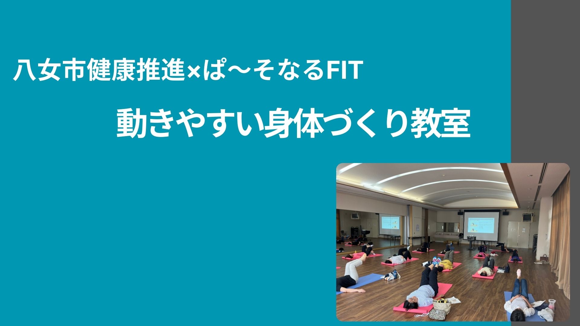 八女市健康推進課より講師依頼をいただき「動きやすい身体づくり教室」の講師をさせていただきました。3回目は【ピラティスで心も身体もリフレッシュ】という内容で、ピラティスとは何か、呼吸や背骨を意識してピラティストレーニングの基礎をおこないました。解剖学、生理学的な観点から理解できるように指導させていただきました。運動前後の姿勢の変化を実際に感じてもらい、受講された方からもこれからも続けてやってみますという声を多くいただきました。ぱ〜そなるケアでは今後とも地域の健康増進や障害予防を通して支援していきたいと思います。